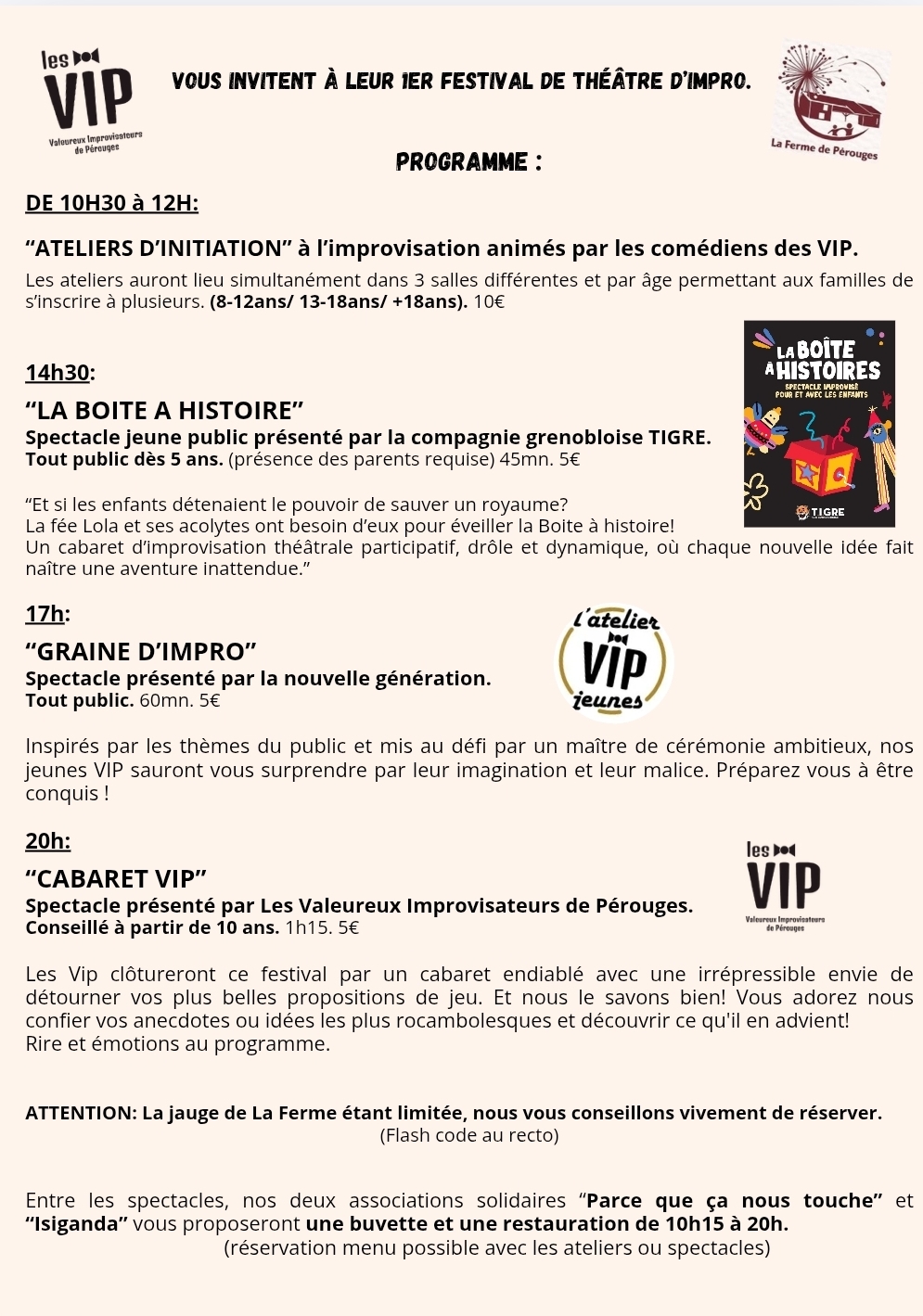 Les Valeureux improvisateurs de Pérouges vous proposent leur 1 festival d Improvisation théâtrale « Quand Pérouges s improvise » ce samedi 18 avril 2026 à La Ferme. Des ateliers d initiation pour tous animés par les VIP et 3 spectacles dont un jeune public proposé par la compagnie du Tigre de Grenoble.